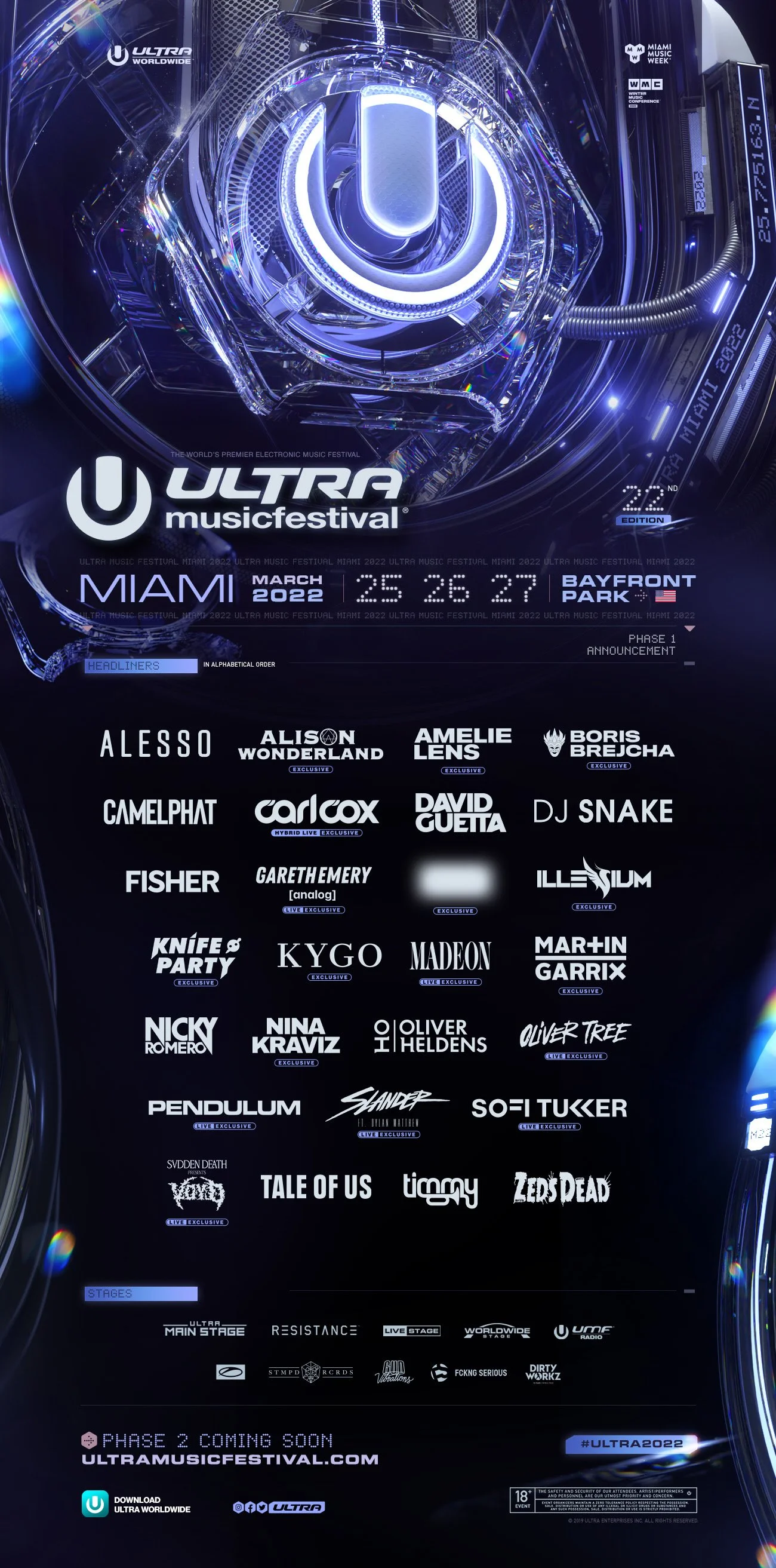 Spanning the vast spectrum of electronic music, Ultra’s Phase 1 headliners include legendary dance acts such as David Guetta, DJ Snake, Alesso, Nina Kraviz, Alison Wonderland, Martin Garrix, Kygo, Amelie Lens, Pendulum (live), Illenium, Madeon (live), Oliver Heldens, Timmy Trumpet, Knife Party and more. Additionally, Ultra Music Festival is incredibly honored to present the highly-anticipated performance of one of the most iconic artists in electronic music history as Sunday’s closing act!