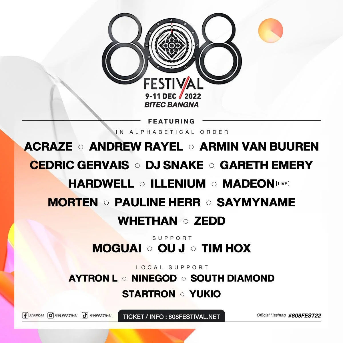 The game-changing 808 Festival is back for its biggest and best edition yet from 9 - 11 December 2022. The leading event in all of Southeast Asia offers up three days of musical madness and brain-boggling production with the likes of Andrew Rayel, Armin Van Buuren, Gareth Emery, DJ Snake, Hardwell, Madeo Live, Zedd, Morten, Illenium and more all playing at Bangkok International Trade Centre. Get your tickets now at https://808festival.net/