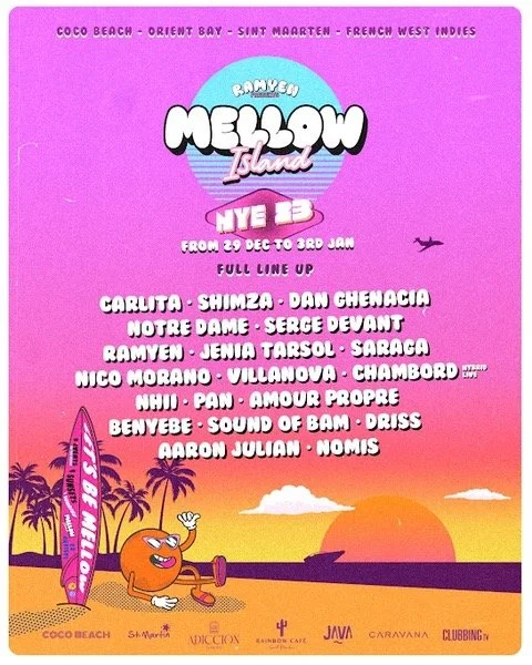 The all new Mellow Island is an invitation to discover the extraordinary beauty of Caribbean island paradise Saint Martin in the French West Indies. From December 29th to January 3rd 2024, the island's most stunning venues will host headliners such as Dan Ghenacia, Serge Deviant, Shimza, Carlita, Notre Dame, Ramyen, Jenia Tarsal, Saraga, Chambord (hybrid live), Villanova, Nico Morano and many more.