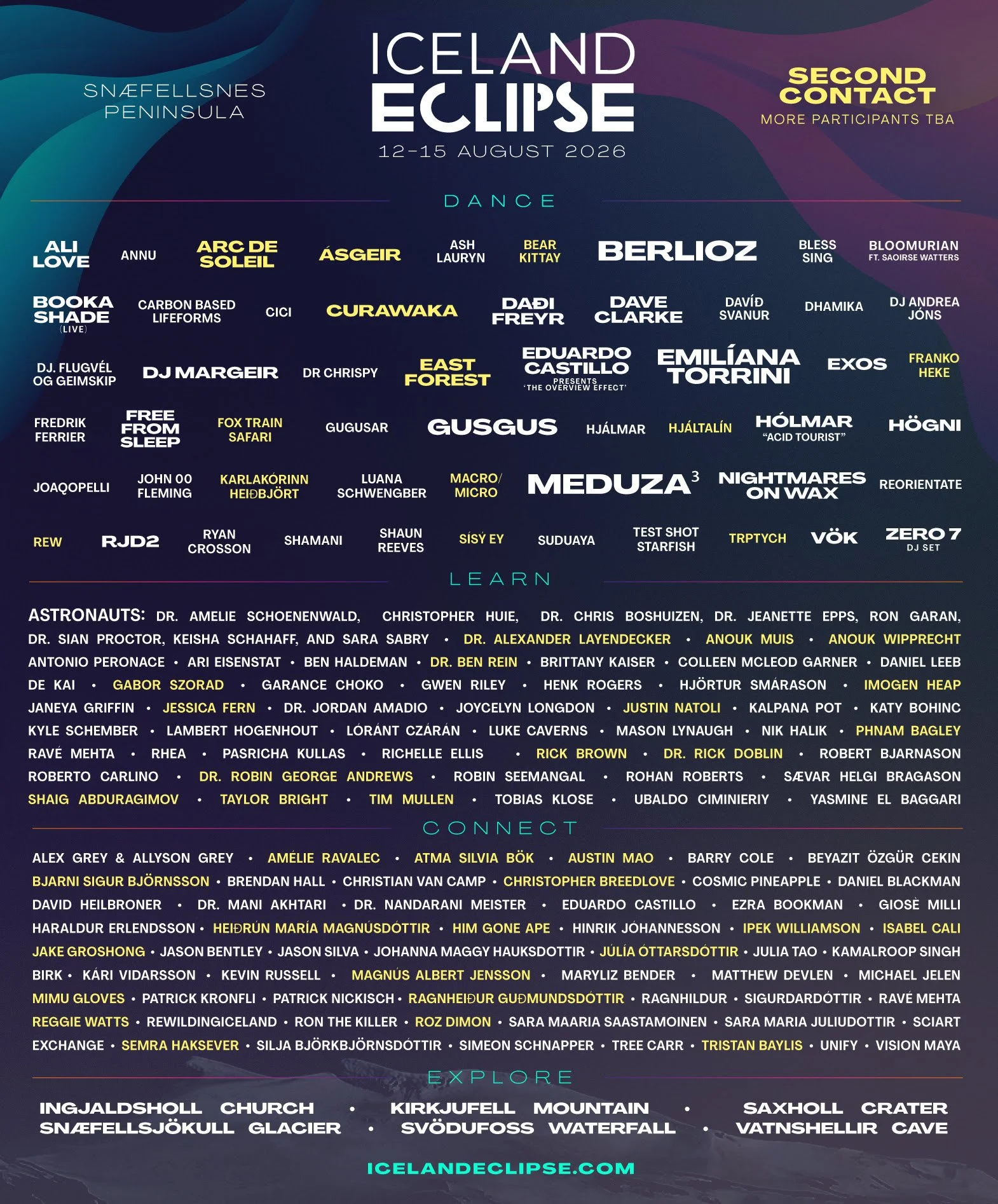Building on the global response sparked by its First Contact announcement, Iceland Eclipse unveils its Second Contact programming with new participants, along with additional Side Quests, and Excursions. From August 12-15, 2026, beneath Iceland’s last total eclipse until 2196, the festival will unite music, art, science, space, and technology through a mix of performances, keynotes, interactive labs, and panels. Set among Hellissandur’s glaciers, volcanic craters, beaches, and waterfalls, and limited to just 3,333 guests, Iceland Eclipse offers an intimate celebration of celestial wonder, creativity, and community, set to be as transformative as the eclipse itself.