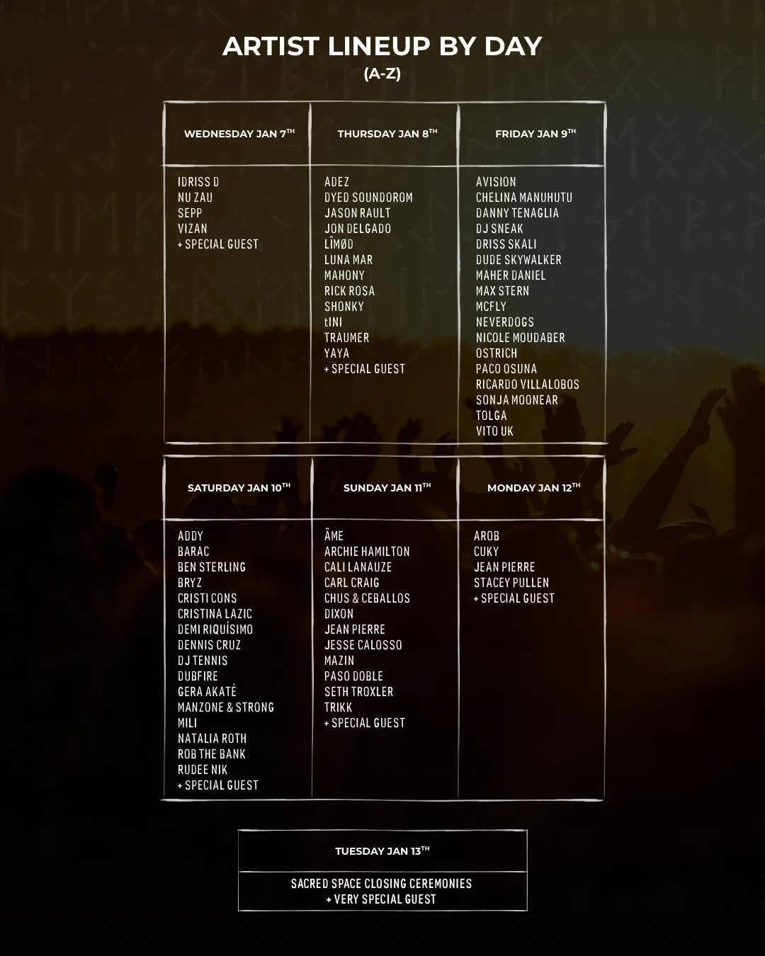 Adiel, Andrés Campo, Anthony Rother, Fatima Hajji, Kobosil, Luciano, Marcel Dettmann, Marco Faraone, Miss Monique, Nico Moreno, Nicolas Lutz, Quest and more to perform